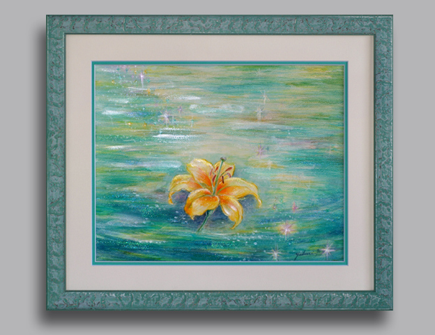 全ての魂が繋がっていることを、思い出させてくれる湖 神秘の湖を思い浮かべて、色を重ねました 星達が煌めきながら降りそそぐ魂の故郷 そこは 平安で慈しみの愛に守られています 私達は輝く魂 どんな時も宇宙にやさしく包まれています。