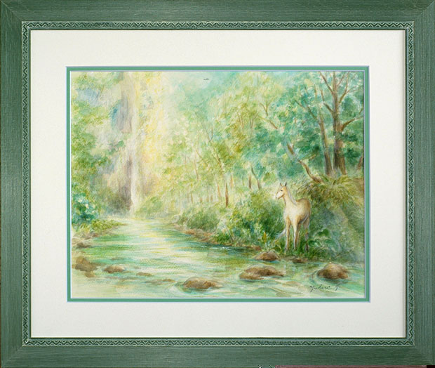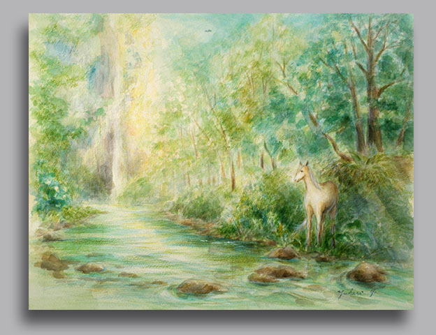 そこは 光に満ち溢れた森でした 全ての命は輝きながら調和している 光が降りそそぐ流れは 清らかに あなたとご家族 それに繋がるすべての命が輝きますように 祈りをこめて描かせていただきました