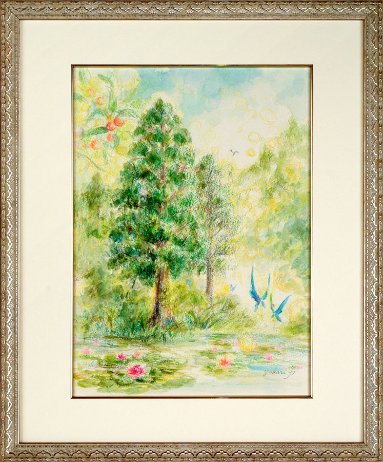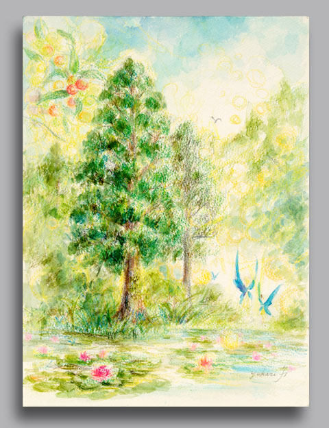 この森は命輝く世界 この平和と喜びが世界に広がりますように 森の中で絵を描いていると かすかに聞こえてきたおしゃべり それは妖精の様な素敵な親子でした。 私はそのお母さんに教えてもらい 一緒にヤマモモをいただきました。 その後 描いたブルーの蝶々 あなたたち親子よ。蝶々になったのと教えたら 女の子は嬉しそうに笑ってくれました。