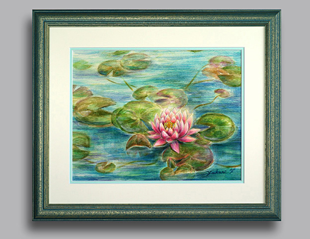 静かな森の池の中、鮮やかに光を放って咲いていました まるで、この花に引き寄せられたようです 日本の人々と大地を思い、癒されることと、希望のある未来を祈り 色を重ねていきました 池に浮かんでいる沢山の葉は それぞれが、花に繋がり精一杯にひかりを集めていました みんなの思いで、もう一度美しい花が咲きますように メールお問い合わせ