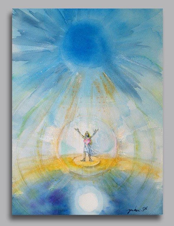 光の大地に立ち 生まれ変わったあなたに宇宙からゴールドのシャワーが降り注ぎます ※ワークの詳しい方法は 中村咲太さん著書「僕が宇宙の仲間に聞いたこと」をご覧ください ワークをしながら感じたエネルギーをイメージして描いています。水彩えのぐ、アクリル 写真.撮影松 永 康 弘氏 額入り写真 写真で ご購入いただけます メールお問い合わせ