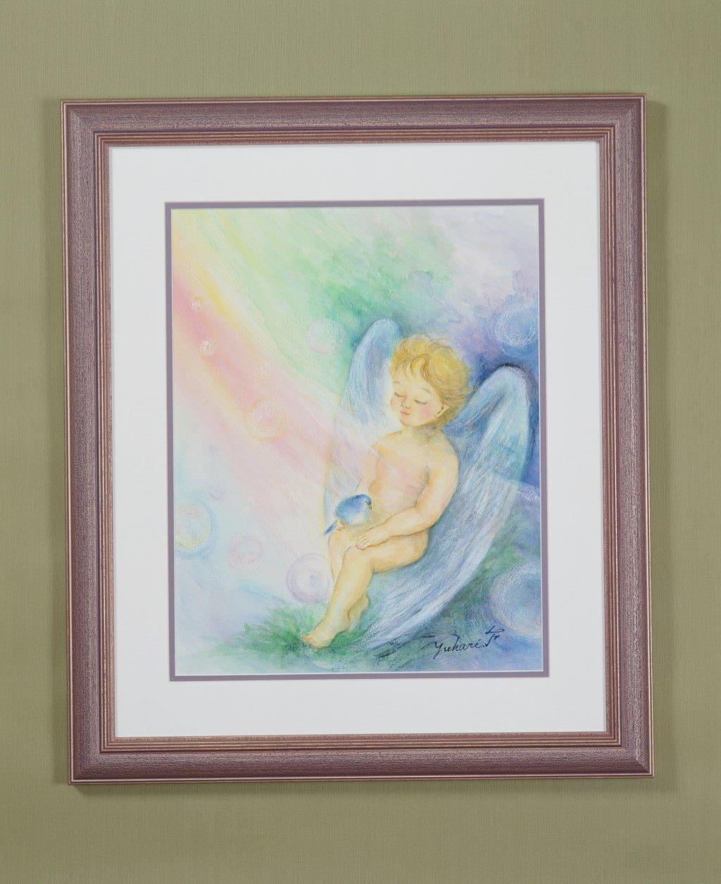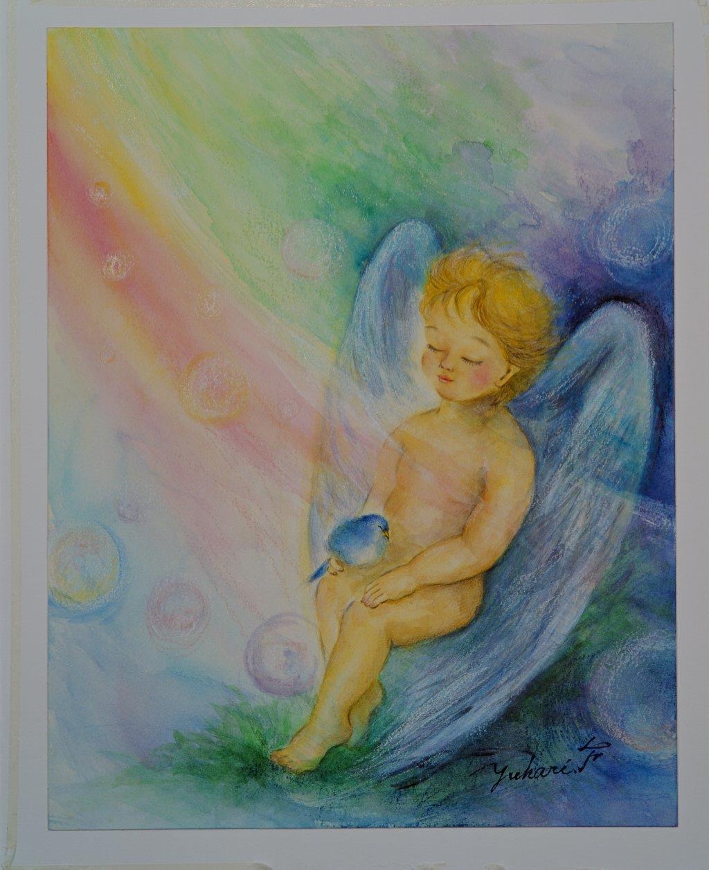 大きな羽を持った天使さんは、あたたかい虹色の光の中 やすらぎを感じていました おひざには、羽をふっくらさせて気持ち良さそうにウトウトしてる鳥さん あなたがどんな時も至福のひとときを感じられますように